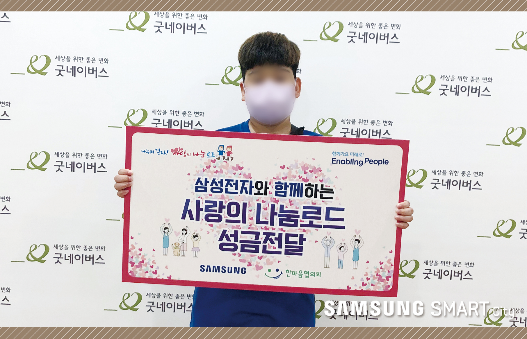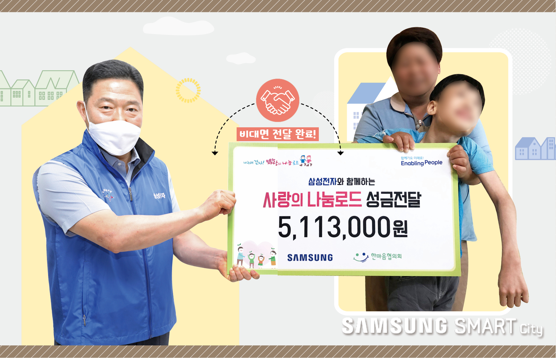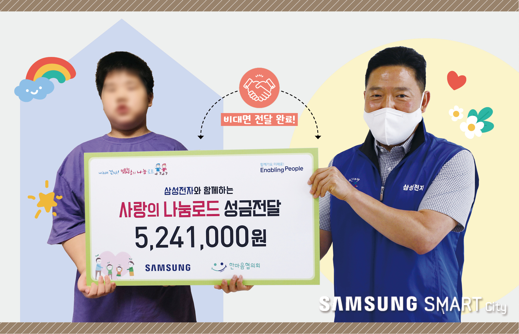 따뜻한 마음을 모아 마련된 123차 사랑의 나눔로드 후원금의 주인공은 바로 호석이(가명)입니다. 희귀질환인 호흡곤란 증후군을 가진 호석이는 태어나자마자 입원치료를 받았습니다. 뇌병변 1급 판정을 받아 초기에는 의사 표시도 가능했지만 힘든 경제적 형편으로 치료가 원활히 이루어지지 않아 현재는 대소변을 가리는 것도 어려운 상황. 물리치료와 함께 지속적인 언어치료가 필수적인데요. 또래에 비해 더디지만 조금씩 성장하고 있는 호석이의 미래를 응원하기 위해 스마트시티는 호석이에게 사랑의 나눔로드 후원금 5,113,000원을 전달했습니다.