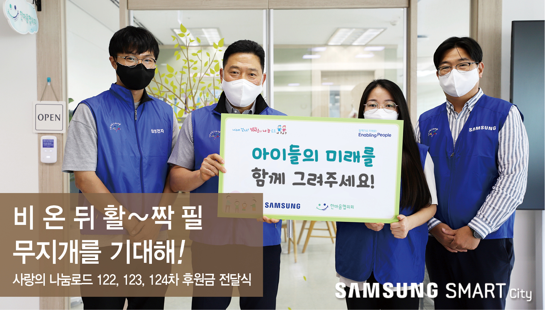 주륵주륵 쉬지 않고 내리는 비에 지치는 와중에도 지역 아이들의 해맑은 웃음을 바라며 스마트시티 임직원이 모아온 122, 123, 124차 사랑의 나눔로드 후원금. 스마트시티가 차곡차곡 쌓인 마음을 품고 사랑의 나눔로드 후원금 주인공들을 만났습니다.