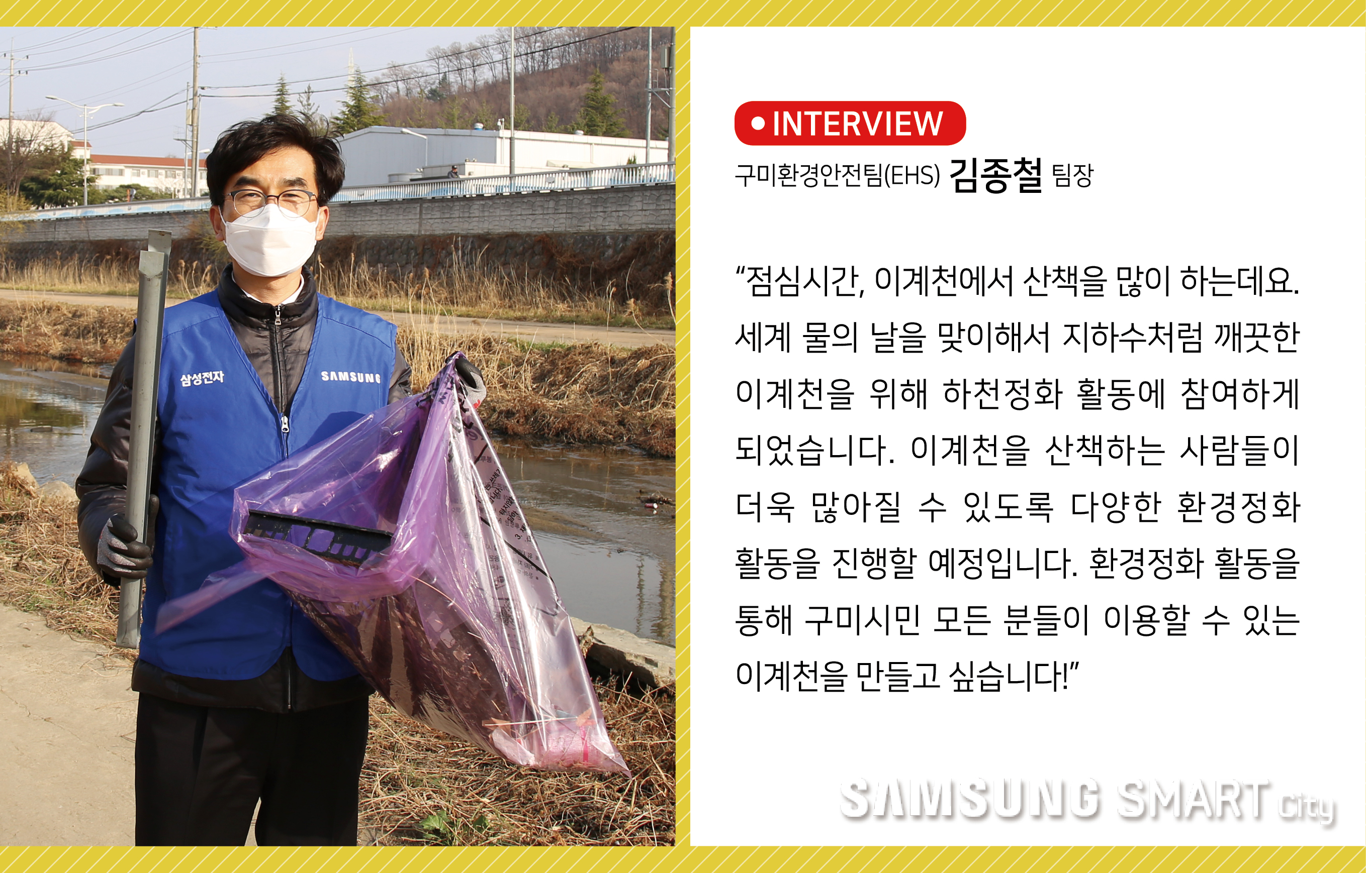 “점심시간, 이계천에서 산책을 많이 하는데요. 세계 물의 날을 맞이해서 지하수처럼 깨끗한 이계천을 위해 하천정화 활동에 참여하게 되었습니다. 이계천을 산책하는 사람들이 더욱 많아질 수 있도록 다양한 환경정화 활동을 진행할 예정입니다. 환경정화 활동을 통해 구미시민 모든 분들이 이용할 수 있는 이계천을 만들고 싶습니다!”