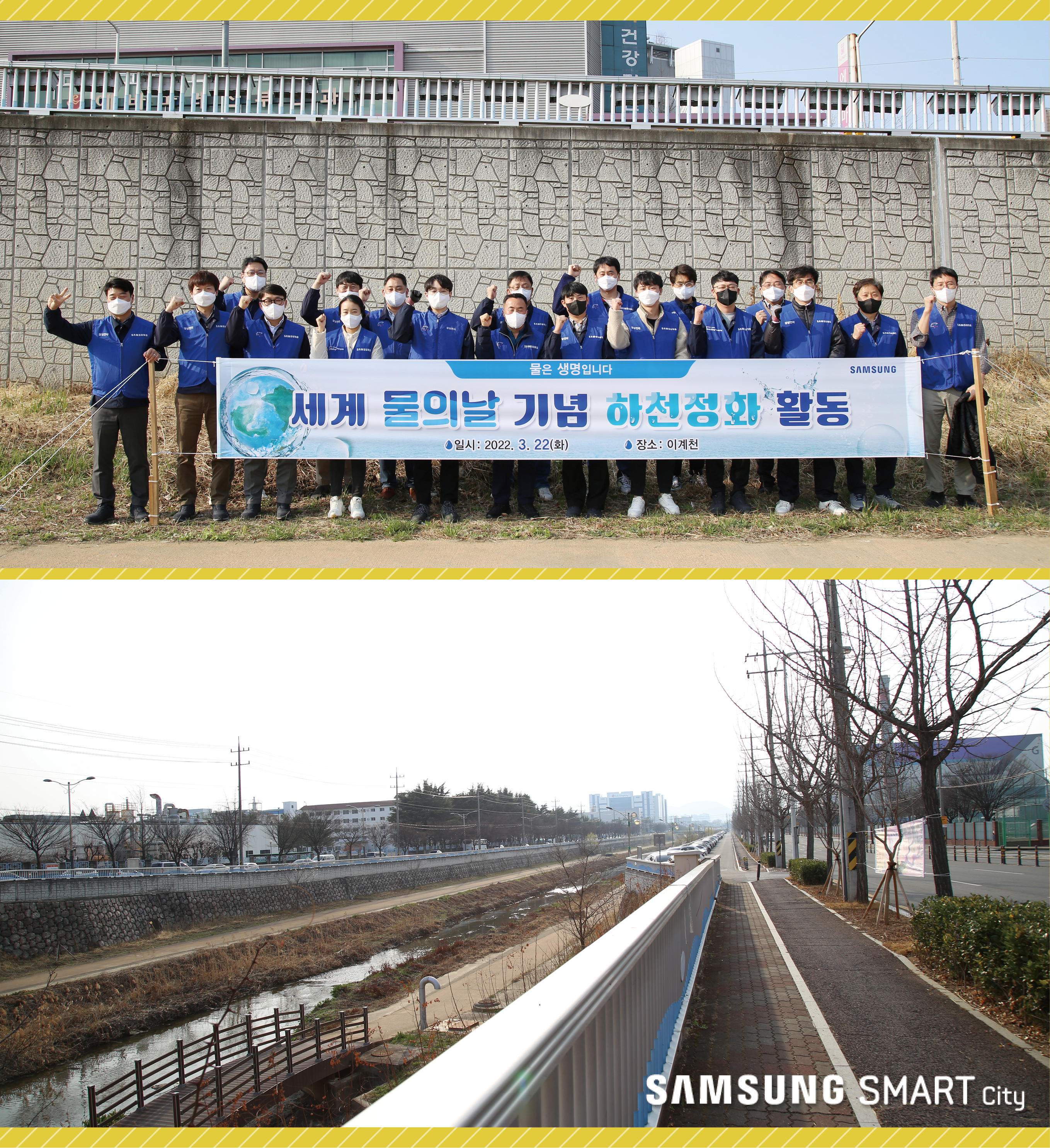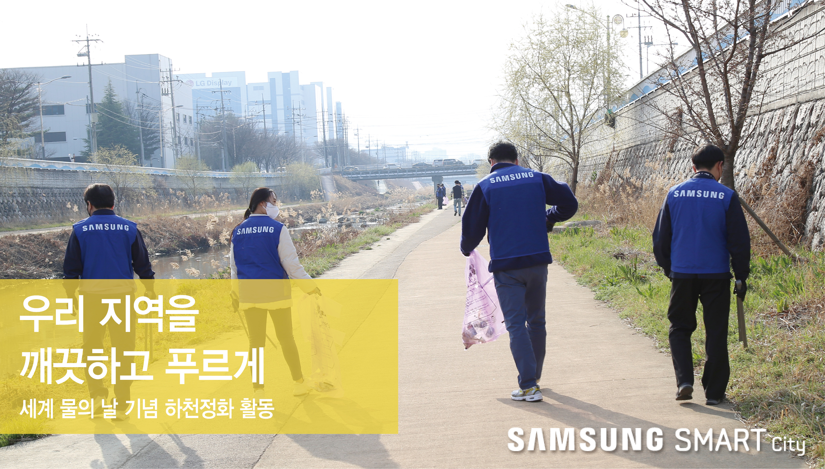 따스한 햇살과 함께 우리에게 다가온 봄! 이맘때쯤이면 겨우내 쌓였던 묵은 먼지를 털어내기 위해 가정에서는 봄맞이 청소를 하곤 하는데요. 지난 3월 22일, ‘세계 물의 날’을 맞아 스마트시티가 구미사업장 근방 이계천 정화 활동에 두 팔 걷고 나섰습니다. 수질 오염과 식수 부족에 대한 경각심을 일깨우기 위해 유엔(UN)이 정한 ‘세계 물의 날’ 기념 하천정화 현장으로 가볼까요?